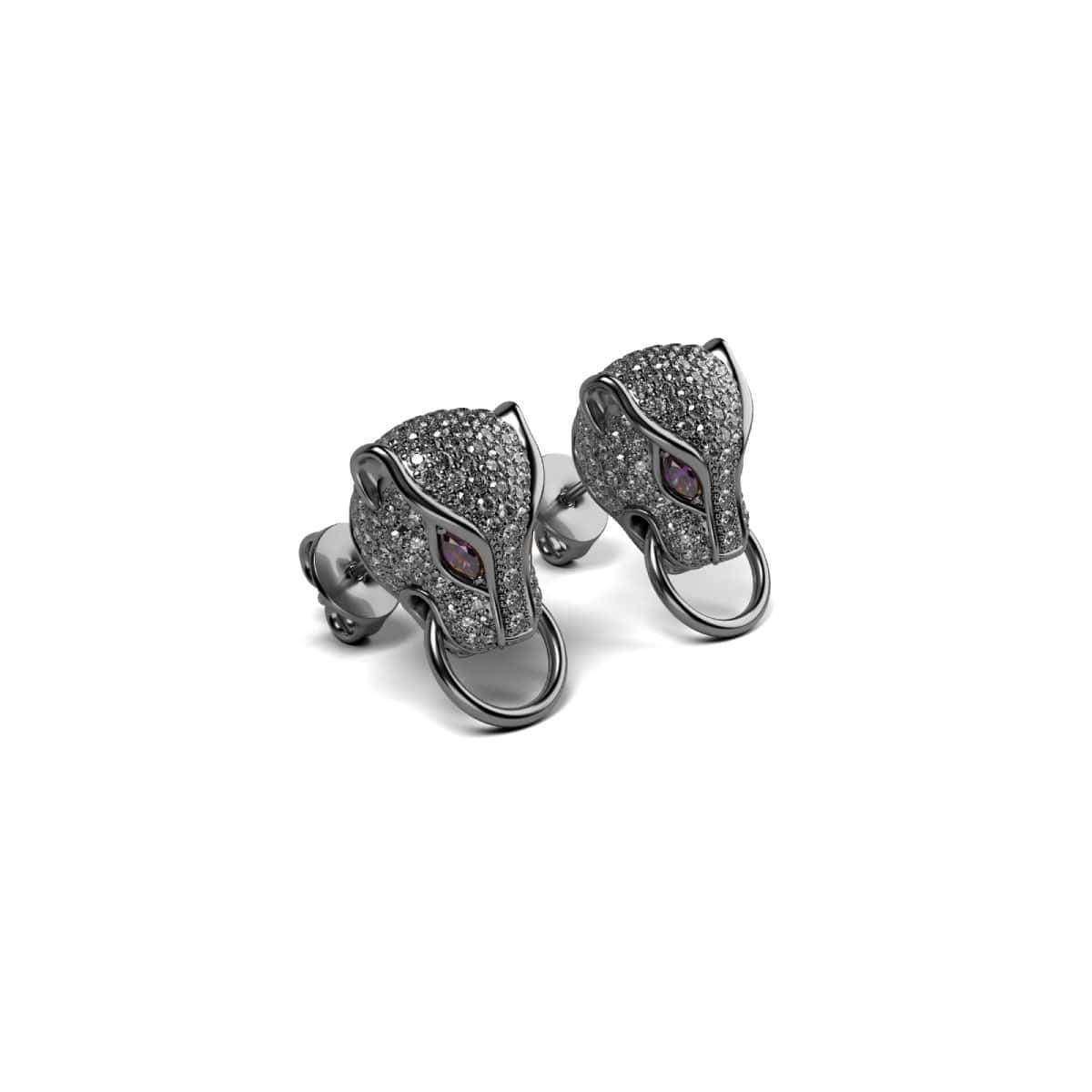 The Panthera Crystal earrings feature hand-crafted, crystal studded panther studs. The Panthera earrings are offered in 18k finishes of rose or white gold and black gunmetal over tarnish free stainless steel.